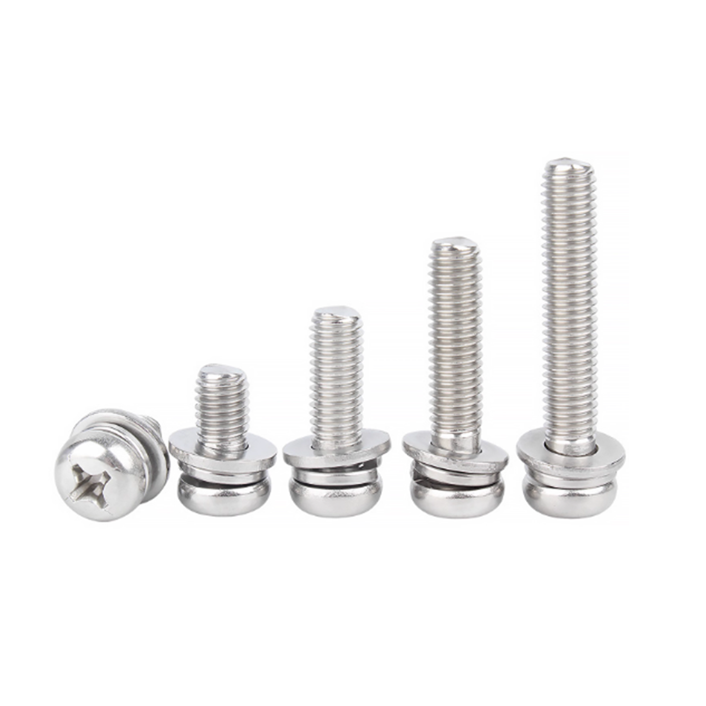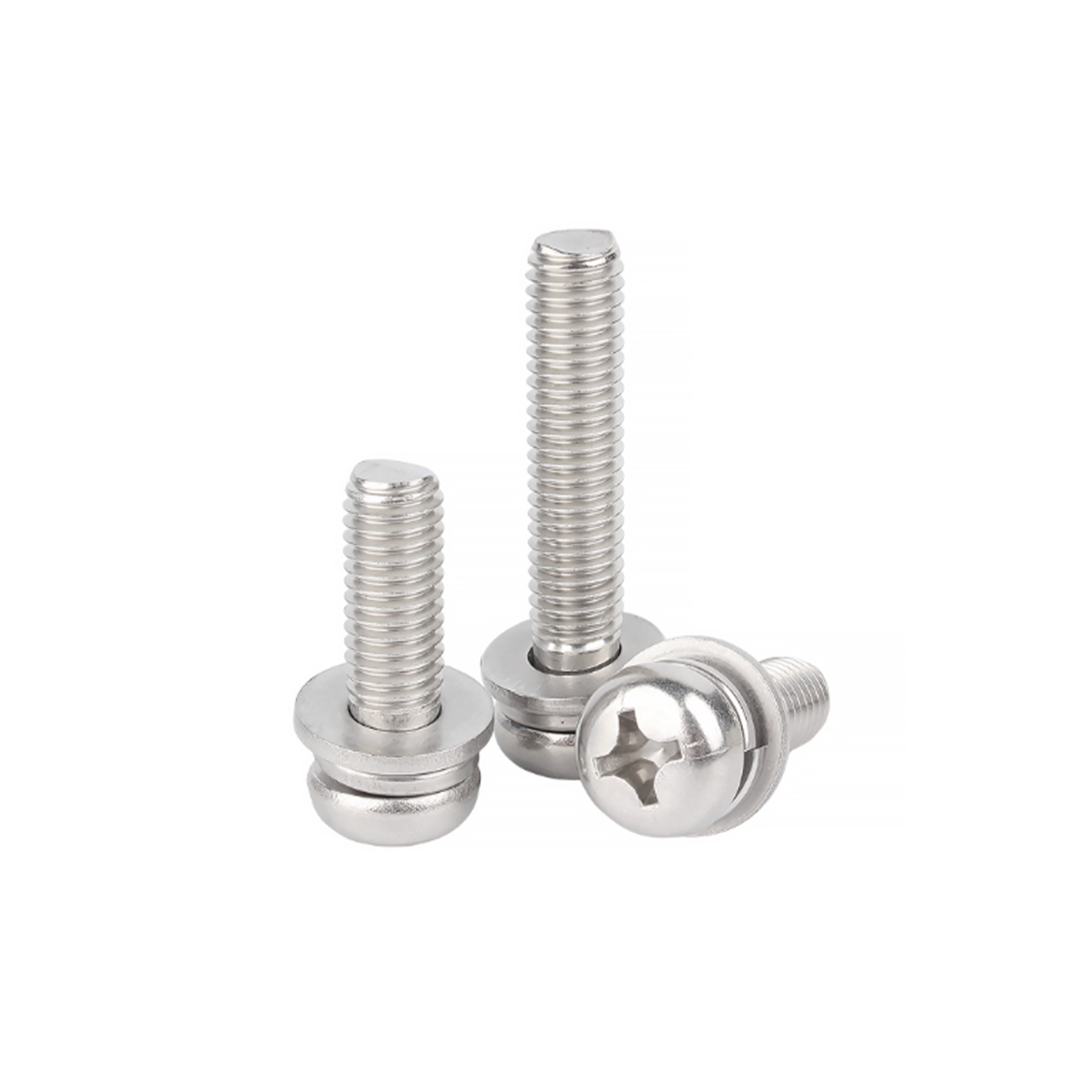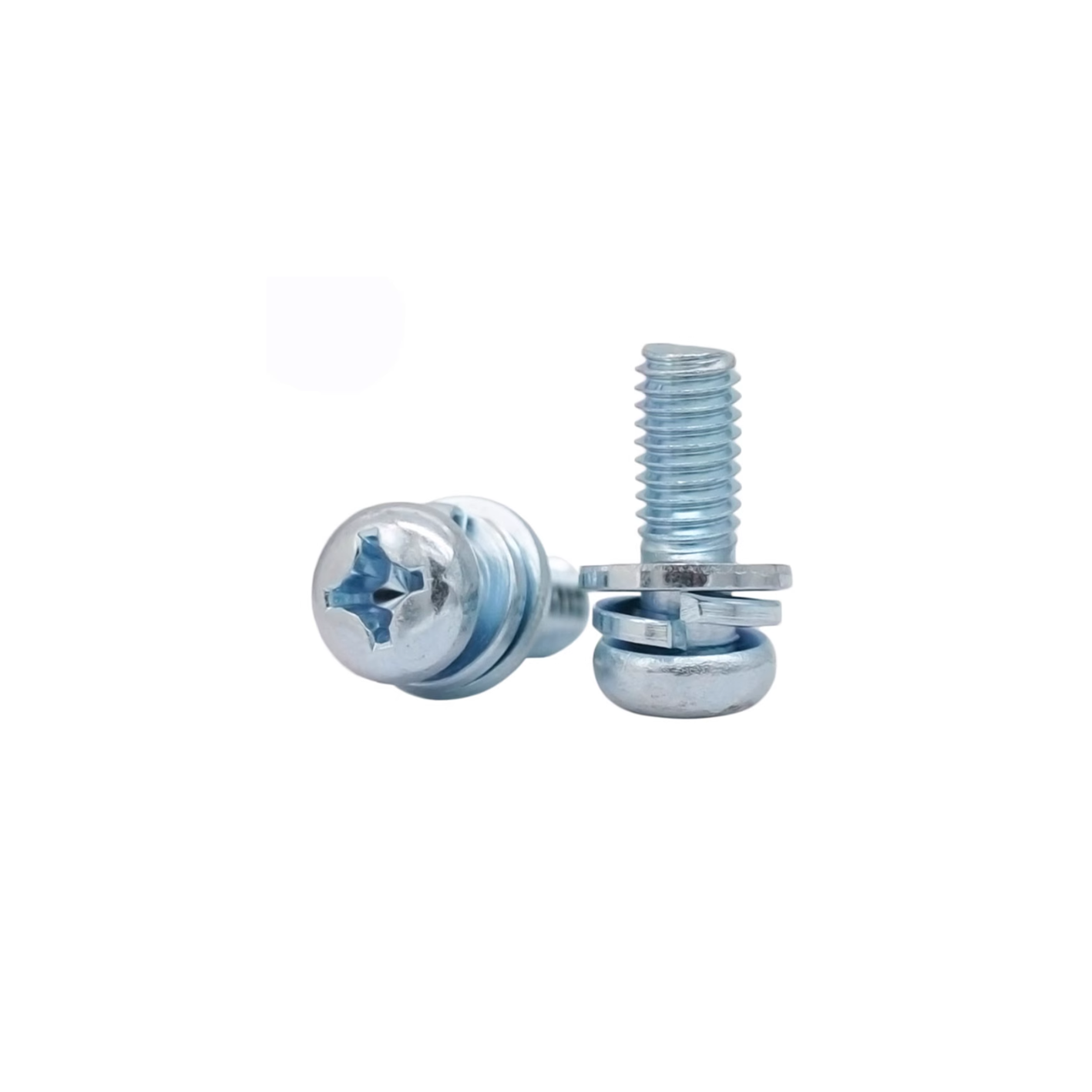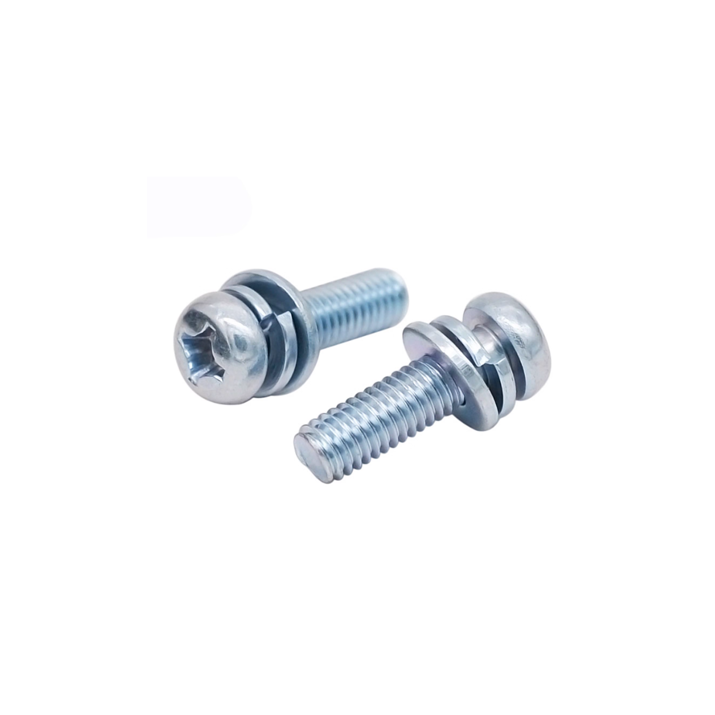 The combination screw pre-assembles a bolt with a flat washer and a spring washer under the hex head. This integrated design streamlines assembly, ensures consistent washer placement, and provides both load distribution and reliable vibration resistance in one ready-to-use fastener.