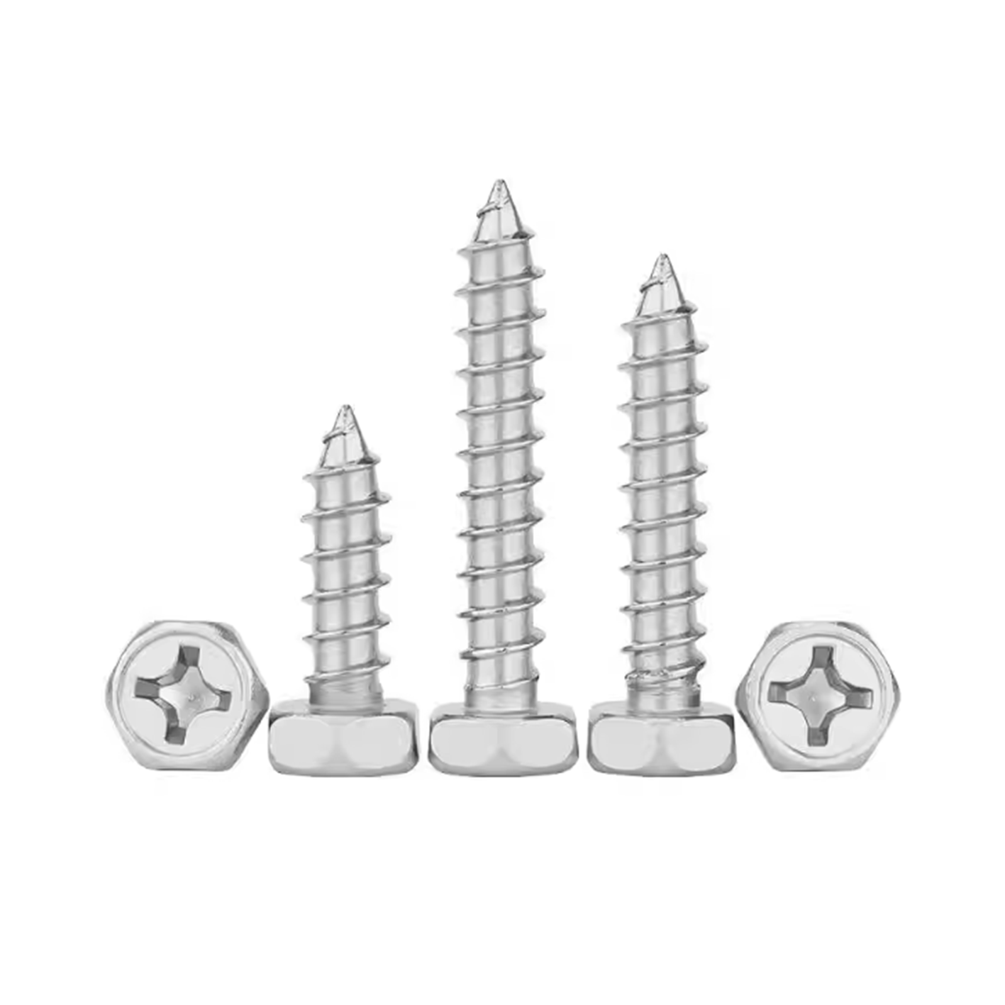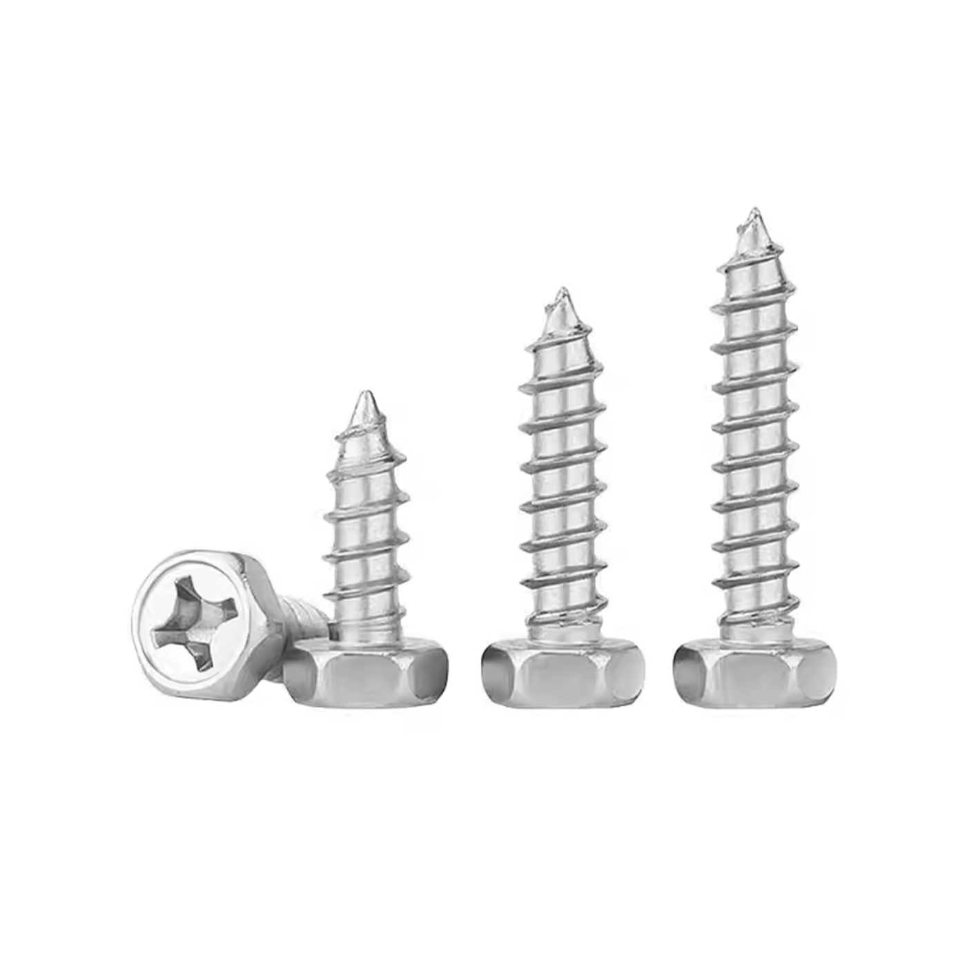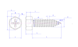 Phillips concave head hex head self-tapping screw integrates hex wrench operation, washer function, convenient cross-slot drive and self-tapping drilling capability. It is particularly suitable for the connection of sheet metal, profiles and non-metallic materials that require large clamping force and anti-loosening effect.